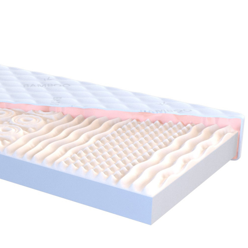 Šedá strana je vyrobena z kvalitní polyuretanové pěny typu T2337 a růžová strana z masážního profilu rozděleného do pěti zón, typ pěny T2536.